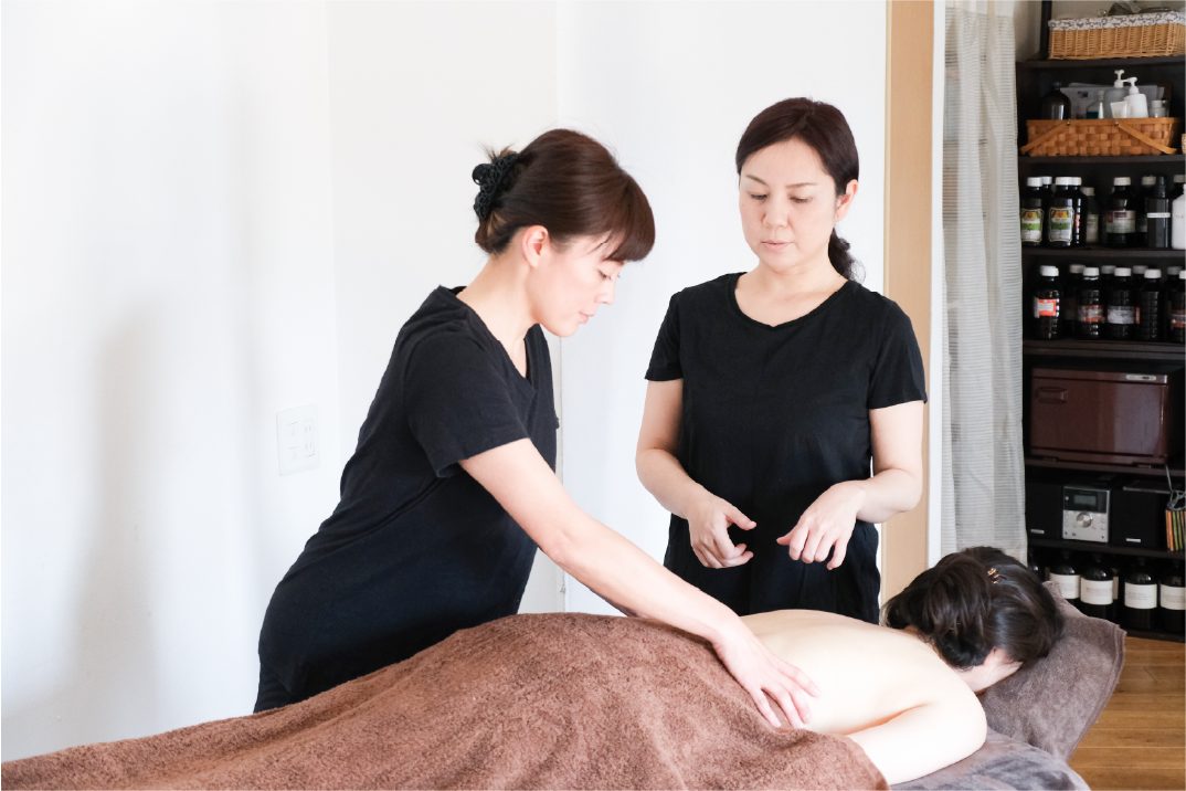 当スクールでは、リラクゼーション効果がより高い「タイラヴィマルダナ」という手技を教えています。 「タイラヴィマルダナ」は、5つの手法を使って、深層部の筋肉までほぐして血行を促進し、 効率的にオイルを浸透させます。